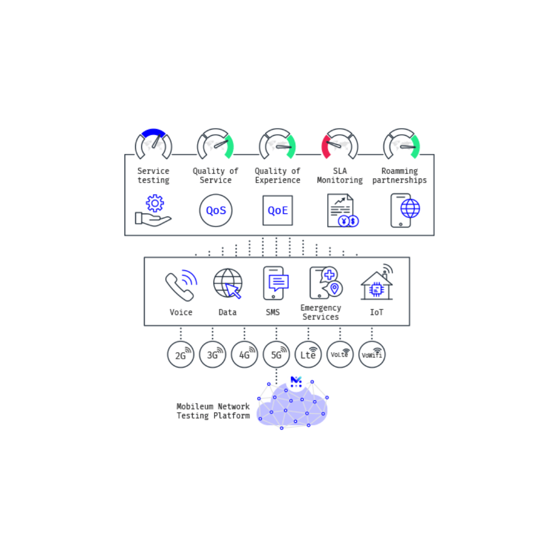 - Synthetic traffic generation across voice, data, messaging, video, and emergency services